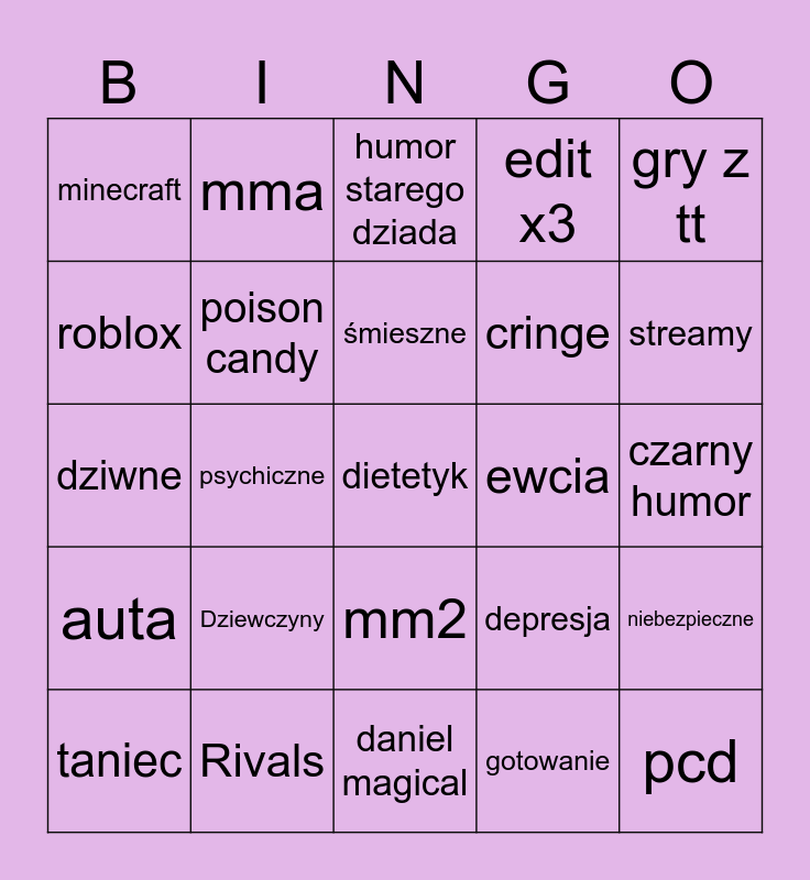 This bingo card has a free space and 24 words: Dziewczyny, Rivals, śmieszne, taniec, gry z tt, minecraft, roblox, mma, ewcia, mm2, cringe, dziwne, depresja, niebezpieczne, poison candy, gotowanie, czarny humor, humor starego dziada, streamy, psychiczne, pcd, auta, edit x3 and daniel magical.