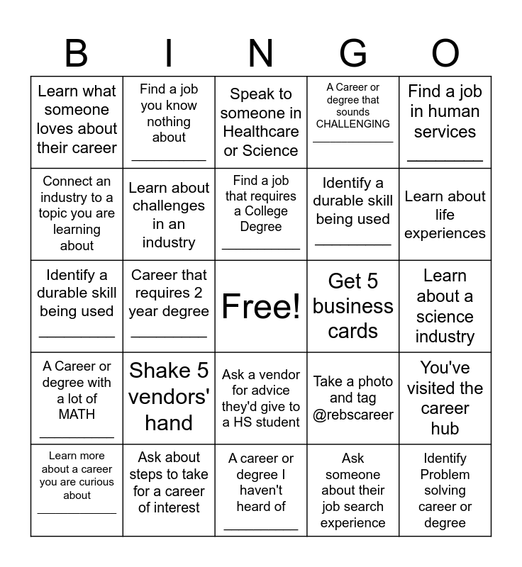This bingo card has a free space and 24 words: Shake 5 vendors' hand, Ask about steps to take for a career of interest, Find a job that requires a College Degree ___________, Learn more about a career you are curious about _____________, Find a job in human services ________, Learn what someone loves about their career, Connect an industry to a topic you are learning about, Find a job you know nothing about __________, Get 5 business cards, Ask a vendor for advice they'd give to a HS student, Identify a durable skill being used _________, Identify a durable skill being used _________, Take a photo and tag @rebscareer, You've visited the career hub, Learn about challenges in an industry, Ask someone about their job search experience, Learn about a science industry, Speak to someone in Healthcare or Science, Learn about life experiences, Career that requires 2 year degree _________, Identify Problem solving career or degree, A Career or degree with a lot of MATH __________, A Career or degree that sounds CHALLENGING ______________ and A career or degree I haven't heard of __________.