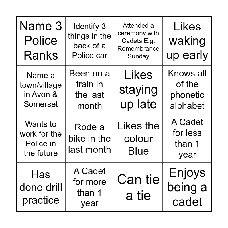 This bingo card has 16 words: A Cadet for more than 1 year, A Cadet for less than 1 year, Attended a ceremony with Cadets E.g. Remembrance Sunday, Name 3 Police Ranks, Wants to work for the Police in the future, Identify 3 things in the back of a Police car, Likes the colour Blue, Can tie a tie, Name a town/village in Avon & Somerset, Been on a train in the last month, Has done drill practice, Likes waking up early, Rode a bike in the last month, Knows all of the phonetic alphabet, Likes staying up late and Enjoys being a cadet.