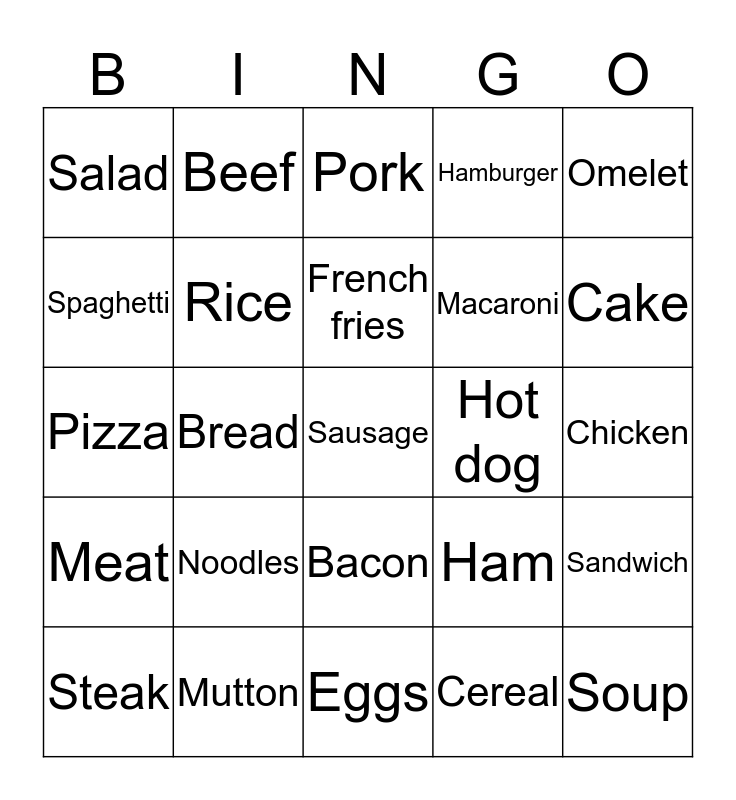 This bingo card has 26 words: Bacon, Cereal, French fries, Mutton, Omelet, Salad, Spaghetti, Beef, Chicken, Ham, Macaroni, Pizza, Sandwich, Steak, Bread, Chicken nuggets, Hamburger, Meat, Pork, Sausage, Cake, Eggs, Hot dog, Noodles, Rice and Soup.