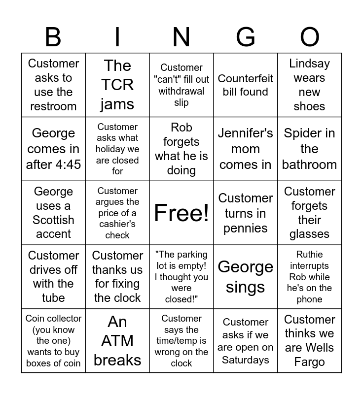 This bingo card has a free space and 24 words: Customer thanks us for fixing the clock, An ATM breaks, Rob forgets what he is doing, Coin collector (you know the one) wants to buy boxes of coin, Lindsay wears new shoes, Customer asks to use the restroom, George comes in after 4:45, The TCR jams, Customer turns in pennies, "The parking lot is empty! I thought you were closed!", Jennifer's mom comes in, George uses a Scottish accent, George sings, Ruthie interrupts Rob while he's on the phone, Customer asks what holiday we are closed for, Customer asks if we are open on Saturdays, Customer forgets their glasses, Customer "can't" fill out withdrawal slip, Spider in the bathroom, Customer argues the price of a cashier's check, Customer thinks we are Wells Fargo, Customer drives off with the tube, Counterfeit bill found and Customer says the time/temp is wrong on the clock.