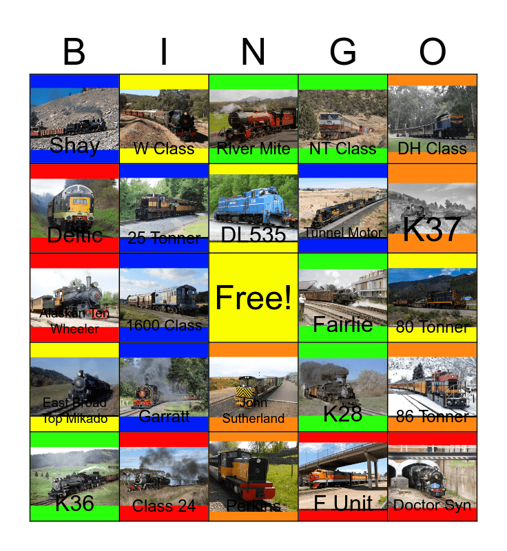 This bingo card has 24 images, a free space and 24 words: Garratt, Class 24, DL535, K36, DH Class, Shay, Deltic, W Class, Fairlie, John Sutherland, Tunnel Motor, Alaskan Ten Wheeler, K28, 86 Tonner, 25 Tonner, F Unit, 80 Tonner, River Mite, K37, 1600 Class, Doctor Syn, East Broad Top Mikado, NT Class and Perkins.