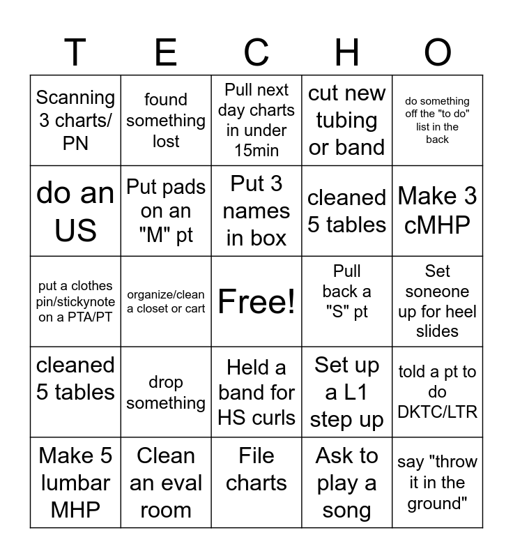 This bingo card has a free space and 29 words: Make 5 lumbar MHP, Cleaned an item that was already clean, organize/clean a closet or cart, Update 6 charts, Scanning 3 charts/ PN, Pull next day charts in under 15min, Put pads on an "M" pt, drop something, Pull back a "S" pt, Clean an eval room, Set soneone up for heel slides, say "throw it in the ground", File charts, Ask to play a song, Make 3 cMHP, Set up a L1 step up, Held a band for HS curls, cleaned 5 tables, do something off the "to do" list in the back, put a clothes pin/stickynote on a PTA/PT, Set up a L1 step up, set up teeter totter, cleaned 5 tables, do an US, cut new tubing or band, found something lost, told a pt to do DKTC/LTR, Put 3 names in box and 1 shoulder CP.