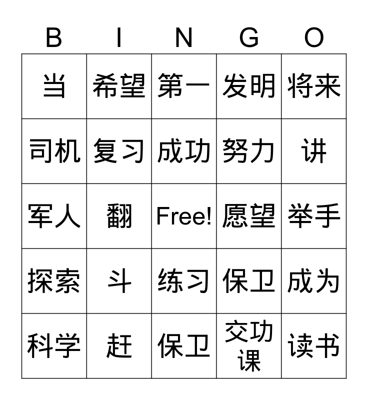 This bingo card has a free space and 24 words: 斗, 赶, 成功, 科学, 将来, 当, 司机, 希望, 愿望, 练习, 努力, 军人, 保卫, 成为, 复习, 交功课, 举手, 第一, 讲, 翻, 读书, 探索, 发明 and 保卫.