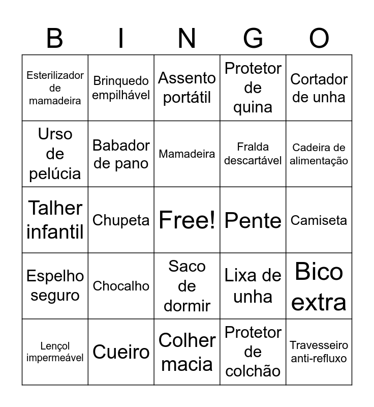 This bingo card has a free space and 100 words: Body, Macacão, Camiseta, Calça, Meias, Luvas, Touca, Casaco, Coletinho, Babador, Faixa de cabelo, Sapatinho, Sandália, Cueiro, Pijama, Saída maternidade, Fralda descartável, Fralda de pano, Lenço umedecido, Pomada para assadura, Sabonete neutro, Shampoo neutro, Toalha com capuz, Pano de boca, Escova de cabelo, Pente, Cortador de unha, Lixa de unha, Termômetro, Aspirador nasal, Chupeta, Esterilizador de mamadeira, Algodão, Lençol de berço, Protetor de colchão, Mamadeira, Bico extra, Aquecedor de mamadeira, Escova de mamadeira, Bombinha de leite, Copinho de transição, Prato infantil, Talher infantil, Babador impermeável, Cadeira de alimentação, Assento portátil, Fórmula infantil, Armazenamento de leite, Bolsa térmica, Colher macia, Tigela com ventosa, Carrinho, Cadeira de carro, Sling, Mochila porta-bebê, Berço portátil, Cercadinho, Protetor de tomada, Grade de porta, Protetor de quina, Trava de armário, Tapete de atividades, Rede portátil, Carrinho guarda-sol, Bolsa de passeio, Protetor solar, Chapéu, Óculos de sol, Termômetro de banho, Monitor de bebê, Babá eletrônica, Chocalho, Mordedor, Brinquedo de banho, Livro de pano, Livro de banho, Tapete sensorial, Urso de pelúcia, Mobile de berço, Caixa musical, Almofada de amamentação, Travesseiro anti-refluxo, Cobertor, Saco de dormir, Brinquedo de encaixe, Brinquedo empilhável, Brinquedo luminoso, Brinquedo sonoro, Brinquedo de movimento, Espelho seguro, Brinquedo tátil, Tapete de yoga, Fralda noturna, Lençol impermeável, Babador de pano, Sacola de maternidade, Termômetro digital, Garrafa térmica, Massageador de gengiva and Brinquedo educativo.