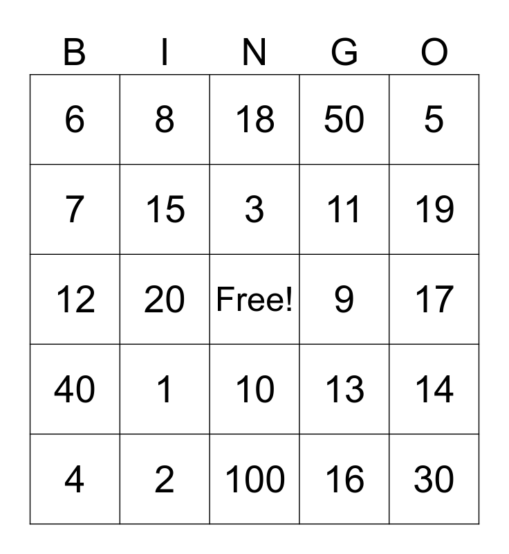 This bingo card has a free space and 24 words: 1, 2, 3, 4, 5, 6, 7, 8, 9, 10, 11, 12, 13, 14, 15, 16, 17, 18, 19, 20, 30, 40, 50 and 100.