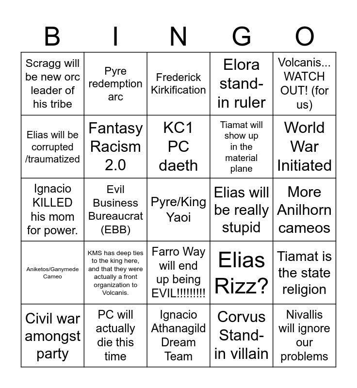 This bingo card has a free space and 24 words: KMS has deep ties to the king here, and that they were actually a front organization to Volcanis., PC will actually die this time, KC1 PC daeth, Civil war amongst party, Volcanis... WATCH OUT! (for us), Scragg will be new orc leader of his tribe, Elias will be corrupted /traumatized, Pyre redemption arc, Elias will be really stupid, Farro Way will end up being EVIL!!!!!!!!!, Tiamat will show up in the material plane, Ignacio KILLED his mom for power., Elias Rizz?, Tiamat is the state religion, Fantasy Racism 2.0, Corvus Stand-in villain, More Anilhorn cameos, Frederick Kirkification, World War Initiated, Evil Business Bureaucrat (EBB), Nivallis will ignore our problems, Aniketos/Ganymede Cameo, Elora stand-in ruler and Ignacio Athanagild Dream Team.