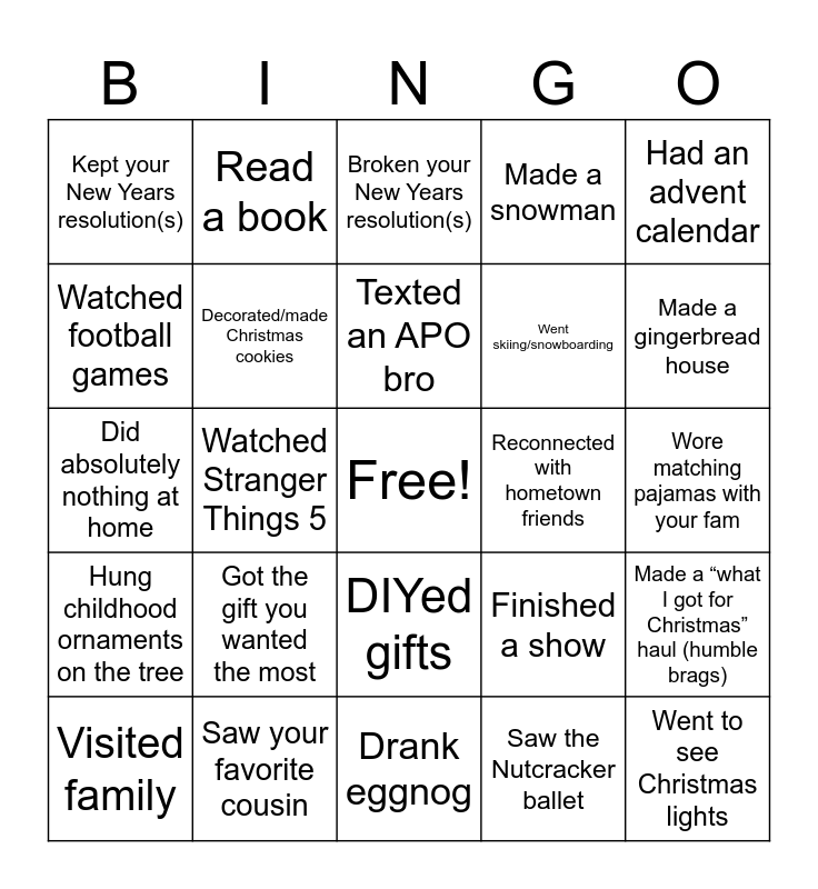This bingo card has a free space and 29 words: Visited family, Went ice skating, Watched Stranger Things 5, Partied for New Years, Kept your New Years resolution(s), Broken your New Years resolution(s), Decorated/made Christmas cookies, Got the gift you wanted the most, Reconnected with hometown friends, Saw your favorite cousin, Wore matching pajamas with your fam, Went to see Christmas lights, Drank eggnog, Saw the Nutcracker ballet, Made a gingerbread house, Traveled out of the country, DIYed gifts, Hung childhood ornaments on the tree, Had an advent calendar, Did absolutely nothing at home, Finished a show, Watched your favorite holiday movie, Went skiing/snowboarding, Watched football games, Made a snowman, Read a book, Made a “what I got for Christmas” haul (humble brags), Texted an APO bro and Went Christmas caroling.