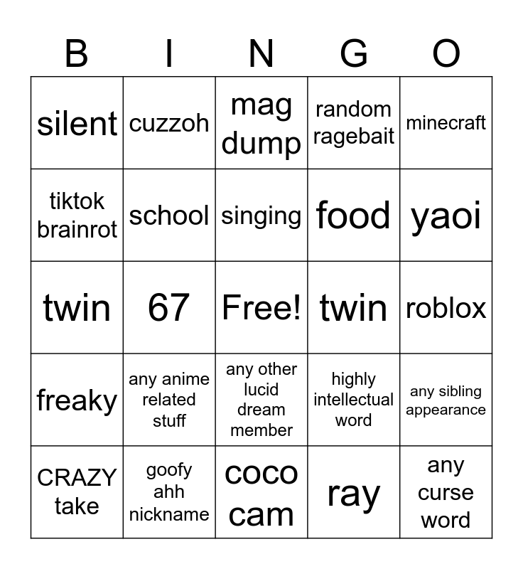 This bingo card has a free space and 24 words: any anime related stuff, goofy ahh nickname, singing, CRAZY take, minecraft, silent, tiktok brainrot, cuzzoh, twin, any other lucid dream member, food, twin, highly intellectual word, any sibling appearance, school, ray, roblox, mag dump, yaoi, 67, any curse word, freaky, random ragebait and coco cam.