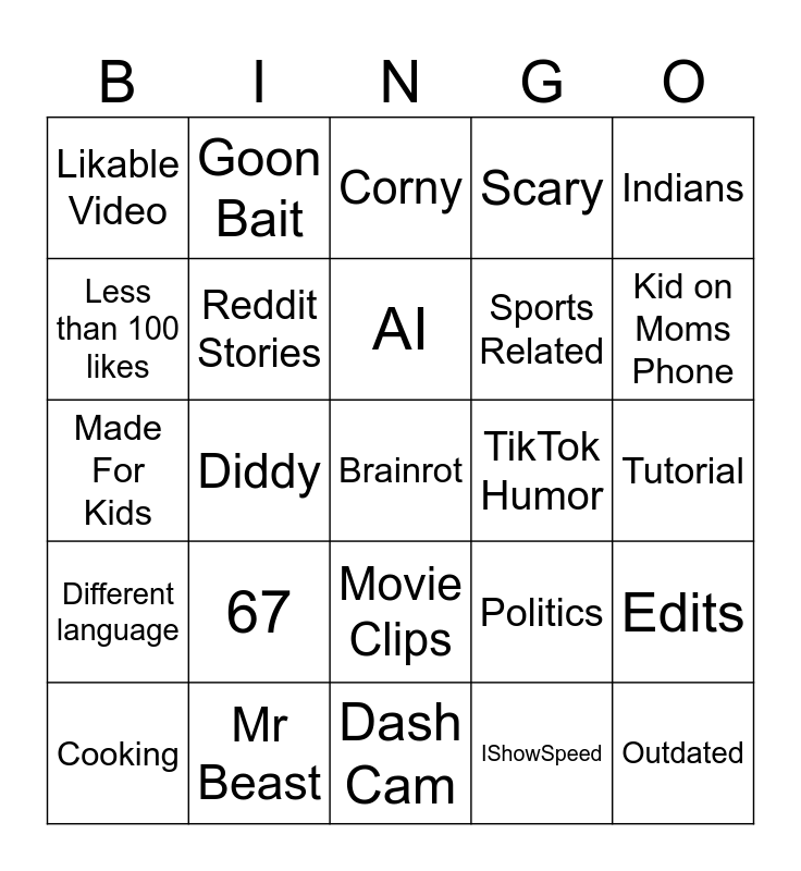 This bingo card has a free space and 24 words: 67, Mr Beast, AI, Cooking, Indians, Likable Video, Less than 100 likes, Goon Bait, TikTok Humor, Movie Clips, Sports Related, Made For Kids, Politics, Edits, Reddit Stories, IShowSpeed, Tutorial, Corny, Kid on Moms Phone, Diddy, Outdated, Different language, Scary and Dash Cam.