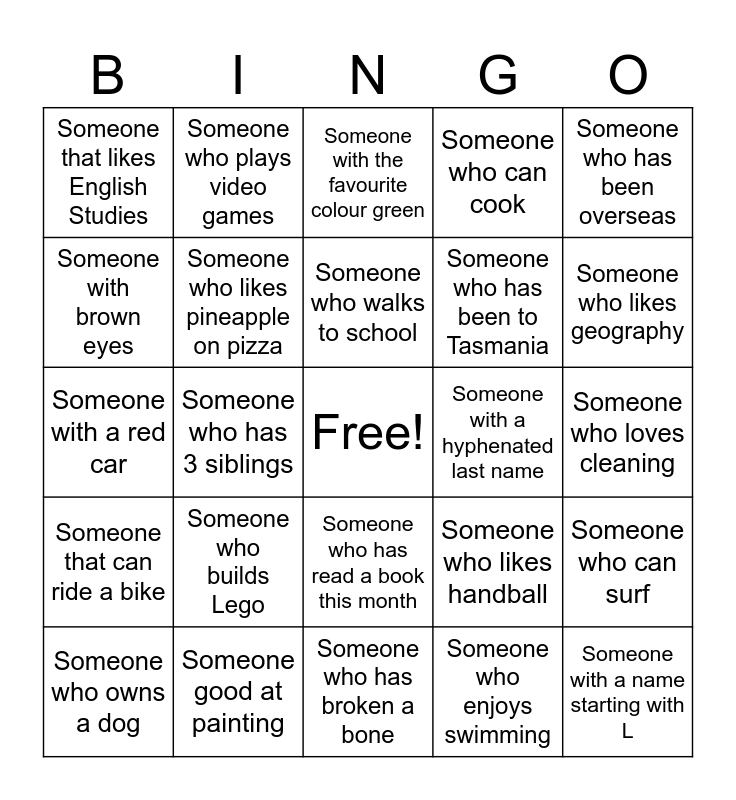 This bingo card has a free space and 24 words: Someone who builds Lego, Someone good at painting, Someone who walks to school, Someone who owns a dog, Someone who has been overseas, Someone that likes English Studies, Someone with brown eyes, Someone who plays video games, Someone with a hyphenated last name, Someone who has read a book this month, Someone who has been to Tasmania, Someone with a red car, Someone who likes handball, Someone who can surf, Someone who likes pineapple on pizza, Someone who enjoys swimming, Someone who loves cleaning, Someone with the favourite colour green, Someone who likes geography, Someone who has 3 siblings, Someone with a name starting with L, Someone that can ride a bike, Someone who can cook and Someone who has broken a bone.