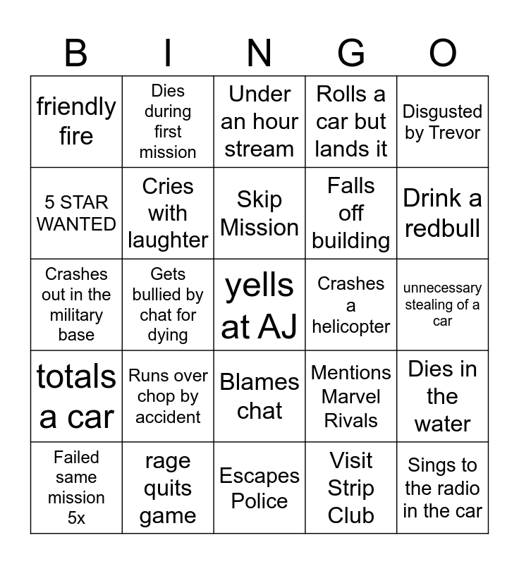 This bingo card has 25 words: totals a car, rage quits game, yells at AJ, Visit Strip Club, Disgusted by Trevor, friendly fire, Dies during first mission, Under an hour stream, Crashes a helicopter, Dies in the water, 5 STAR WANTED, Cries with laughter, Escapes Police, Mentions Marvel Rivals, Drink a redbull, Failed same mission 5x, Gets bullied by chat for dying, Skip Mission, Falls off building, unnecessary stealing of a car, Crashes out in the military base, Runs over chop by accident, Blames chat, Rolls a car but lands it and Sings to the radio in the car.