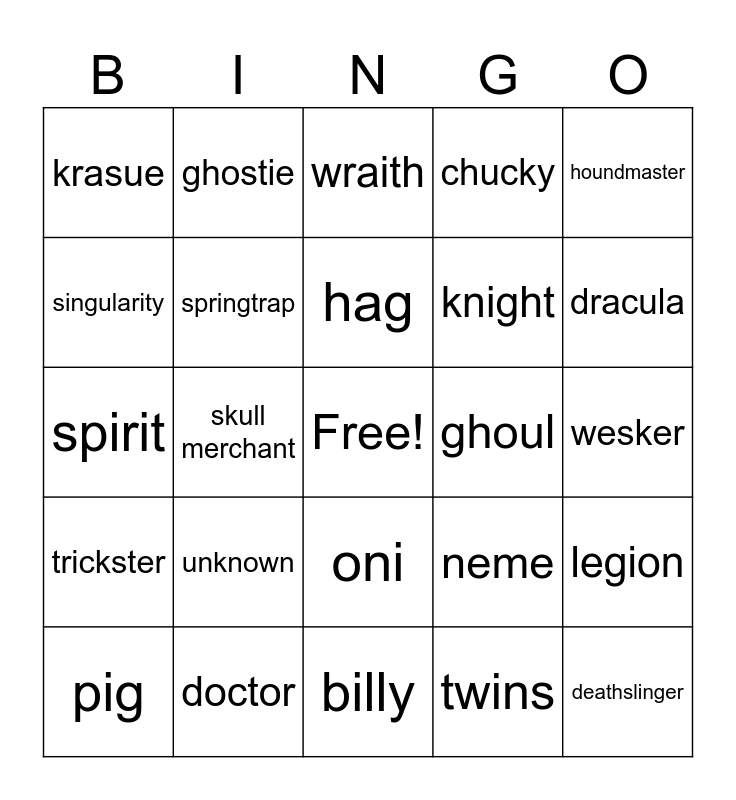 This bingo card has a free space and 24 words: unknown, doctor, hag, pig, houndmaster, krasue, singularity, ghostie, ghoul, oni, knight, spirit, neme, legion, springtrap, twins, wesker, wraith, dracula, skull merchant, deathslinger, trickster, chucky and billy.