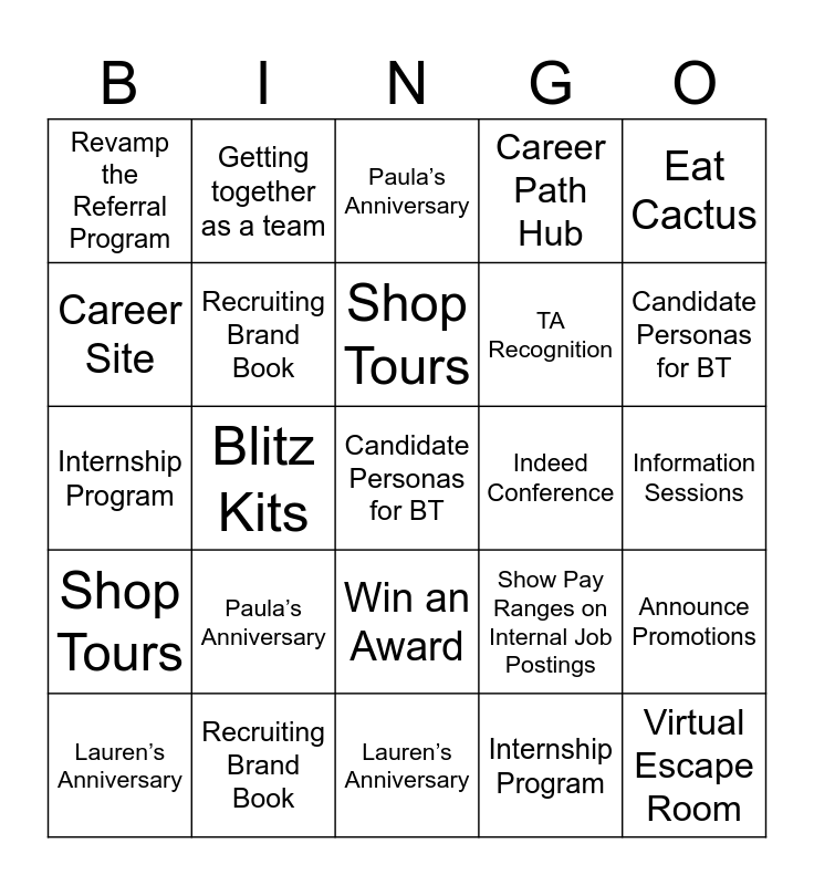 This bingo card has 51 words: Free!, Candidate Personas for BT, Talent Newsletter, Lauren’s Anniversary, Paula’s Anniversary, Hanna’s Anniversary, Getting together as a team, Veronica’s Anniversary, Career Site, Competitor Catalog, Recruiting Brand Book, Career Path Hub, Announce Promotions, Show Pay Ranges on Internal Job Postings, New Job Titles, Information Sessions, Shop Tours, Indeed Conference, Team learning opportunity, Eat Cactus, Blitz Kits, Internship Program, Revamp the Referral Program, TA Recognition, Win an Award, Virtual Escape Room, Candidate Personas for BT, Talent Newsletter, Lauren’s Anniversary, Paula’s Anniversary, Hanna’s Anniversary, Getting together as a team, Veronica’s Anniversary, Career Site, Competitor Catalog, Recruiting Brand Book, Career Path Hub, Announce Promotions, Show Pay Ranges on Internal Job Postings, New Job Titles, Information Sessions, Shop Tours, Indeed Conference, Team learning opportunity, Eat Cactus, Blitz Kits, Internship Program, Revamp the Referral Program, TA Recognition, Win an Award and Virtual Escape Room.