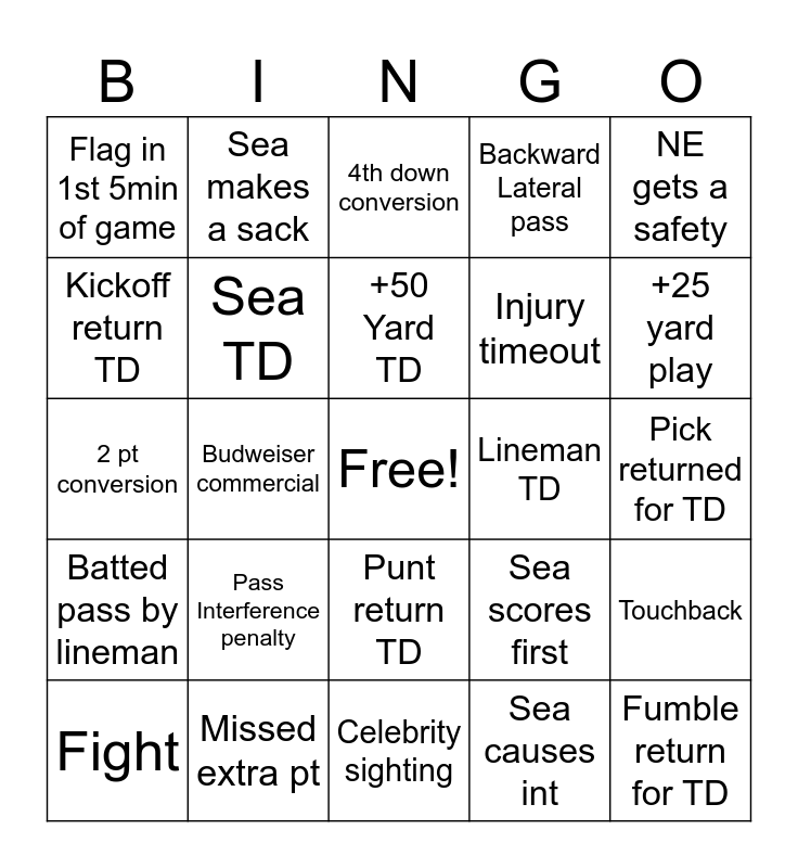 This bingo card has a free space and 37 words: NE causes int, NE causes fumble, NE TD, Sea TD, Touchback, Pass Interference penalty, +50 Yard TD, Tails, NE gets a safety, Heads, Budweiser commercial, Backward Lateral pass, Fumble return for TD, Pick returned for TD, Kickoff return TD, Batted pass by lineman, Missed FG, 4th down conversion, Punt return TD, Lineman TD, Flag in 1st 5min of game, +25 yard play, Fight, Celebrity sighting, Sea causes fumble, Sea causes int, Sea makes a sack, Sea gets a safety, Player loses helmet, Customer boo’s bad bunny, Excessive celebration penalty, Missed extra pt, 2 pt conversion, NE scores first, Sea scores first, Injury timeout and TD celebration dance.