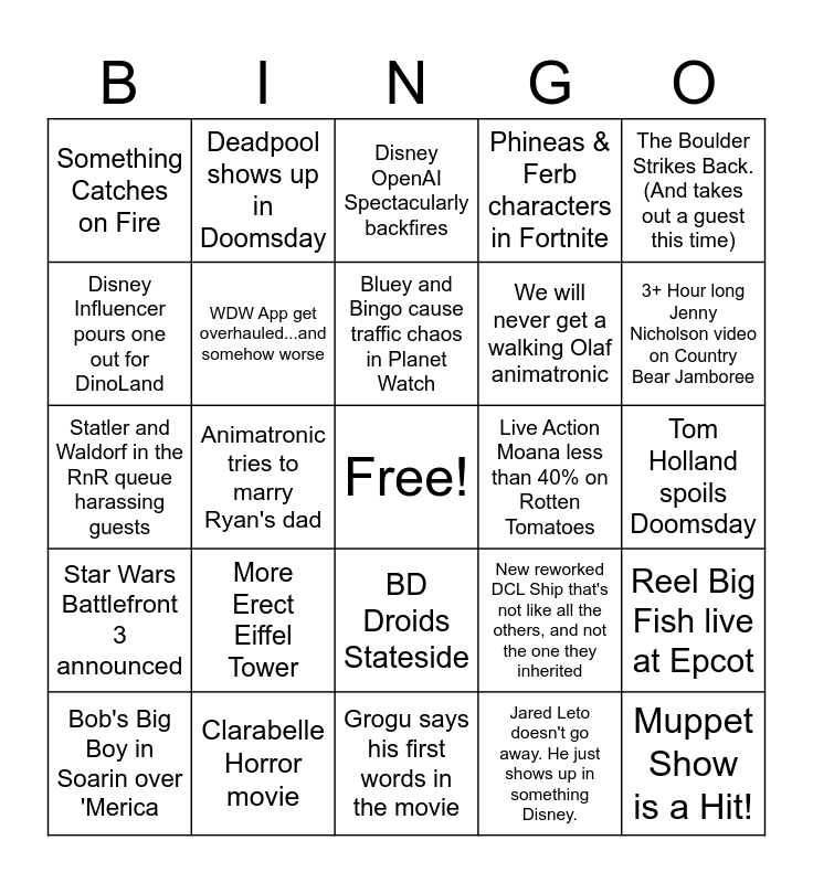 This bingo card has a free space and 24 words: More Erect Eiffel Tower, Clarabelle Horror movie, Bluey and Bingo cause traffic chaos in Planet Watch, Bob's Big Boy in Soarin over 'Merica, The Boulder Strikes Back. (And takes out a guest this time), Something Catches on Fire, Disney Influencer pours one out for DinoLand, Deadpool shows up in Doomsday, Live Action Moana less than 40% on Rotten Tomatoes, BD Droids Stateside, We will never get a walking Olaf animatronic, Statler and Waldorf in the RnR queue harassing guests, New reworked DCL Ship that's not like all the others, and not the one they inherited, Reel Big Fish live at Epcot, WDW App get overhauled...and somehow worse, Jared Leto doesn't go away. He just shows up in something Disney., Tom Holland spoils Doomsday, Disney OpenAI Spectacularly backfires, 3+ Hour long Jenny Nicholson video on Country Bear Jamboree, Animatronic tries to marry Ryan's dad, Muppet Show is a Hit!, Star Wars Battlefront 3 announced, Phineas & Ferb characters in Fortnite and Grogu says his first words in the movie.