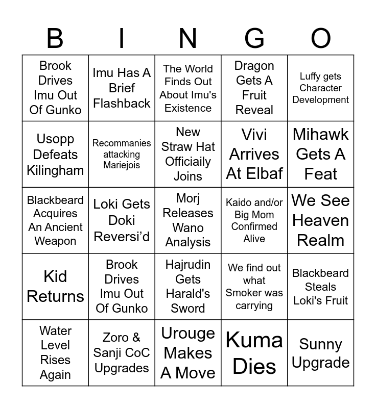 This bingo card has a free space and 24 words: Brook Drives Imu Out Of Gunko, Zoro & Sanji CoC Upgrades, New Straw Hat Officiaily Joins, Water Level Rises Again, Luffy gets Character Development, Brook Drives Imu Out Of Gunko, Usopp Defeats Kilingham, Imu Has A Brief Flashback, Kaido and/or Big Mom Confirmed Alive, Hajrudin Gets Harald's Sword, Vivi Arrives At Elbaf, Blackbeard Acquires An Ancient Weapon, We find out what Smoker was carrying, Blackbeard Steals Loki's Fruit, Recommanies attacking Mariejois, Kuma Dies, We See Heaven Realm, The World Finds Out About Imu's Existence, Mihawk Gets A Feat, Loki Gets Doki Reversi’d, Sunny Upgrade, Kid Returns, Dragon Gets A Fruit Reveal and Urouge Makes A Move.
