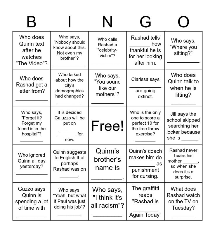 This bingo card has a free space and 34 words: What does Quinn find at school on Tuesday? ________, The graffitti reads "Rashad is ________ Again Today", Who wants the basketball team to avoid all distractions? _______, The only basketball palyers who sit inside are _______., Who ignored Quinn all day yesterday? ____________, Who talked about how the city's demographics had changed? _________, Who says, "Where you sitting?" ___________, Guzzo says Quinn is spending a lot of time with __________, Who says, "Nobody should know about this. Not even my brother"? _____________, Guzzo says there's probably gonna be a ________ at the police department because "there's always" one these days., Who says, "You sound like our mothers"? ___________, Who calls Rashad a "celebrity-victim"? _____________, Who tells Quinn he's gotta fix the team? _______, Who is visiting the basketball team soon? __________, Who is the only one to score a perfect 10 for the free throw exercise? ________, Who does Quinn talk to when he is lifting? ________, Who says, "Yeah, but what if Paul was just doing his job"? _________, Who says, "Forget it? Forget my friend is in the hospital"? _________, Quinn suggests to English that perhaps Rashad was on _______., Quinn's coach makes him do _________ as punishment for cursing., Quinn's brother's name is ________., What does Quinn finally watch? ___________., Who does Quinn text after he watches "The Video"?, Jill says the school skipped searching her locker because she is ______., Who says, "I think it's all racism"? ________, What does Rashad watch on the TV on Tuesday? ________, Rashad tells _______ how thankful he is for her looking after him., Who says, "It's my pleasure. Just trying to add a little sunshine"?, Clarissa says ____________ are going extinct., Who does Rashad get a letter from? ___________, Who says, "You are not a criminal, Rashad" ? ________, It is decided Galuzzo will be put on ________ ________ for now., Rashad never hears his mother ______, so when she does it's a surprise. and What is Spoony's girlfriend's name? __________.