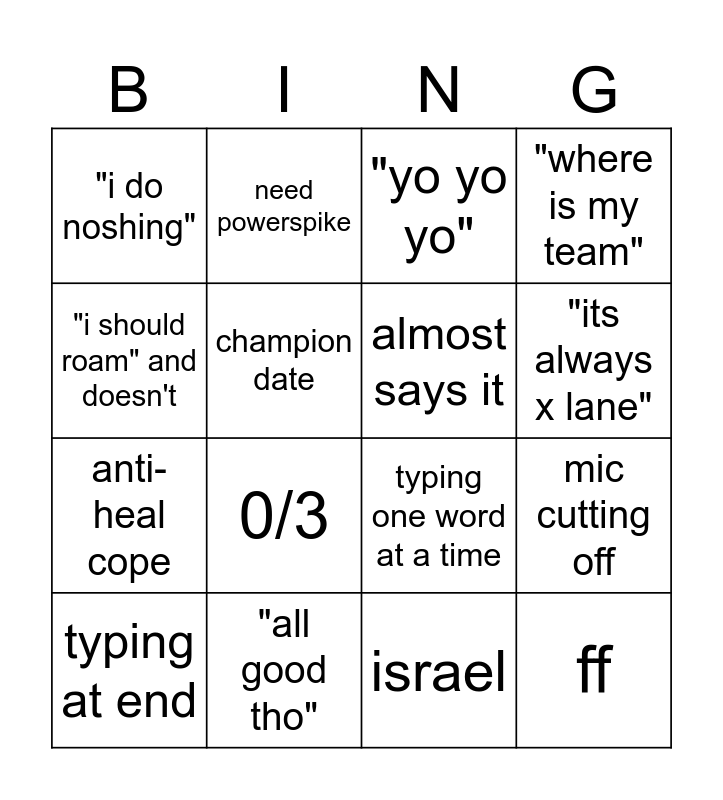 This bingo card has 16 words: "all good tho", mic cutting off, "yo yo yo", "i do noshing", anti-heal cope, need powerspike, typing one word at a time, israel, "i should roam" and doesn't, champion date, typing at end, "where is my team", 0/3, "its always x lane", almost says it and ff.
