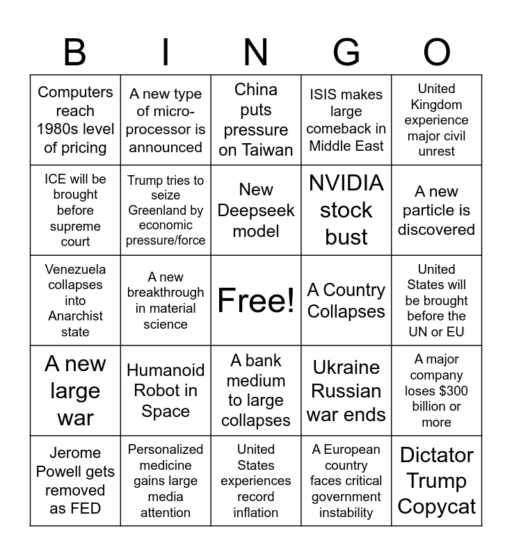 This bingo card has a free space and 24 words: Jerome Powell gets removed as FED, Humanoid Robot in Space, New Deepseek model, A European country faces critical government instability, United Kingdom experience major civil unrest, Computers reach 1980s level of pricing, A new type of micro-processor is announced, China puts pressure on Taiwan, A Country Collapses, United States will be brought before the UN or EU, Venezuela collapses into Anarchist state, Trump tries to seize Greenland by economic pressure/force, Ukraine Russian war ends, A major company loses $300 billion or more, ICE will be brought before supreme court, Personalized medicine gains large media attention, United States experiences record inflation, ISIS makes large comeback in Middle East, A new particle is discovered, A new large war, A new breakthrough in material science, A bank medium to large collapses, NVIDIA stock bust and Dictator Trump Copycat.