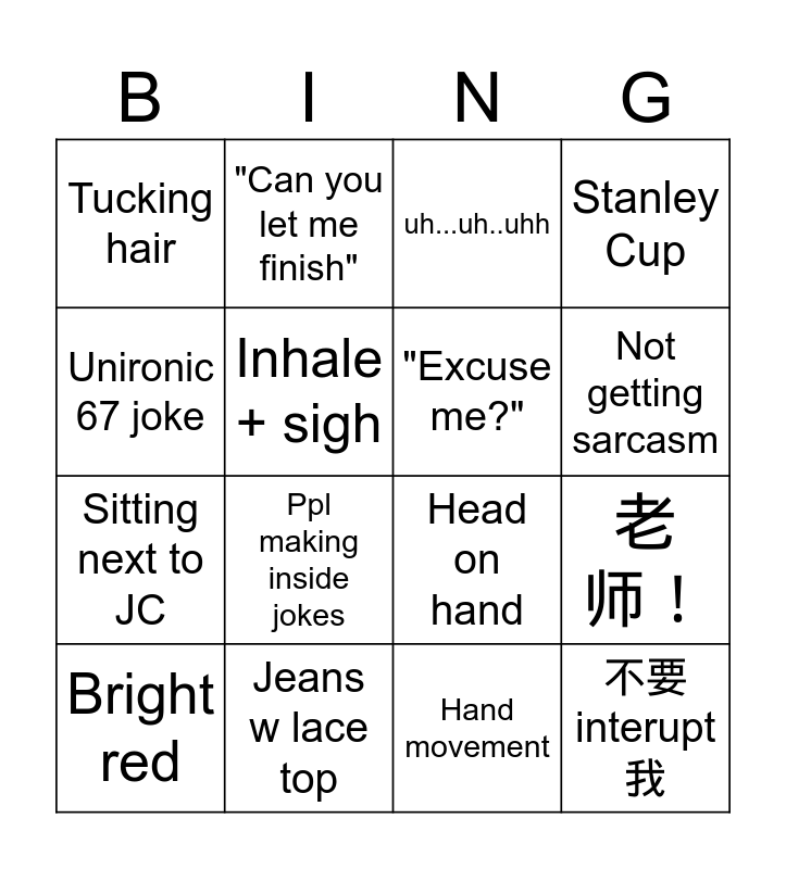 This bingo card has 16 words: Bright red, Jeans w lace top, uh...uh..uhh, Stanley Cup, Unironic 67 joke, "Can you let me finish", Head on hand, 老师!, Tucking hair, Inhale + sigh, Hand movement, Not getting sarcasm, Sitting next to JC, Ppl making inside jokes, "Excuse me?" and 不要interupt 我.
