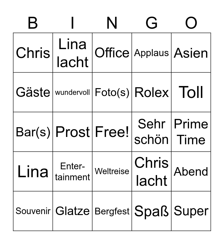 This bingo card has a free space and 39 words: Danke, Gastgeber, Team, wundervoll, Souvenir, Weltreise, Foto(s), Chef, Asien, Lina, Prost, Applaus, Super, Prime Time, Sehr schön, Enter-tainment, Tokio, Chris, Spiel, Chris lacht, Gäste, Bergfest, Rolex, Toll, Spitze, Kamera, Wetter, Masterplan, AIDAdiva, Lina lacht, Linda, Regie, Office, Glatze, Spaß, wunderschön, Abend, Bar(s) and Theatrium.