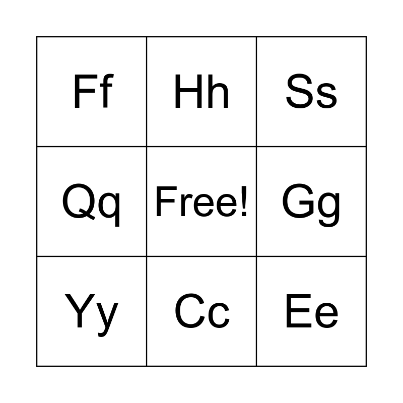 This bingo card has a free space and 26 words: Aa, Bb, Cc, Dd, Ee, Ff, Gg, Hh, Ii, Jj, Kk, Ll, Mm, Nn, Oo, Pp, Qq, Rr, Ss, Tt, Uu, Vv, Ww, Xx, Yy and Zz.