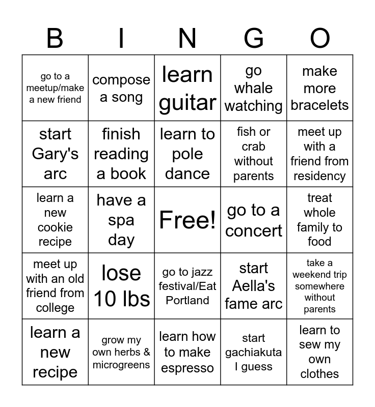 This bingo card has a free space and 24 words: lose 10 lbs, grow my own herbs & microgreens, learn to pole dance, learn a new recipe, make more bracelets, go to a meetup/make a new friend, start Gary's arc, compose a song, go to a concert, go to jazz festival/Eat Portland, fish or crab without parents, learn a new cookie recipe, start Aella's fame arc, take a weekend trip somewhere without parents, finish reading a book, start gachiakuta I guess, treat whole family to food, learn guitar, meet up with a friend from residency, have a spa day, learn to sew my own clothes, meet up with an old friend from college, go whale watching and learn how to make espresso.