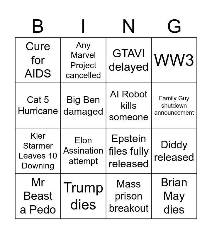 This bingo card has 16 words: Trump dies, Diddy released, GTAVI delayed, Cure for AIDS, Kier Starmer Leaves 10 Downing, Any Marvel Project cancelled, Epstein files fully released, Mass prison breakout, Cat 5 Hurricane, Big Ben damaged, Mr Beast a Pedo, WW3, Elon Assination attempt, Family Guy shutdown announcement, AI Robot kills someone and Brian May dies.
