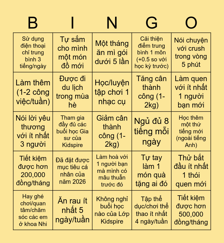This bingo card has a free space and 29 words: Hay ghé chơi/quan tâm/chăm sóc các em ở khoa Nhi, Đạt giải thưởng cho hoạt động văn nghệ/thi đua của Trung Tâm, Tham gia đầy đủ các buổi học Gia sư của Kidspire, Giúp các cô/chú của Trung tâm làm việc (chép sổ, phụ bếp,...), Sử dụng điện thoại chỉ trung bình 3 tiếng/ngày, Một tháng ăn mì gói dưới 5 lần, Được đi du lịch trong mùa hè, Đã đặt được mục tiêu cá nhân của năm 2026, Ngủ đủ 8 tiếng mỗi ngày, Ăn rau ít nhất 5 ngày/tuần, Học thêm một thứ tiếng mới (ngoài tiếng Anh), Tiết kiệm được hơn 500,000 đồng/tháng, Không nghỉ buổi học nào của Lớp Kidspire, Tập thể dục/chơi thể thao ít nhất 4 ngày/tuần, Làm quen với ít nhất 1 người bạn mới, Còn nhớ các kiến thức cơ bản về Bánh xe cảm xúc, Làm hoà với 1 người bạn mà mình có mâu thuẫn trước đó, Tiết kiệm được hơn 200,000 đồng/tháng, Nói chuyện với crush trong vòng 5 phút, Nói lời yêu thương với ít nhất 3 người, Tự tay làm 1 món quà tặng ai đó, Điểm trung bình môn cuối HK1 trên 7.0, Tăng cân thành công (1-2kg), Làm thêm (1-2 công việc/tuần), Cải thiện điểm trung bình 1 môn (+0.5 so với học kỳ trước), Tự sắm cho mình một món đồ mới, Thử bắt đầu ít nhất 1 thói quen mới, Học/luyện tập chơi 1 nhạc cụ and Giữ gìn vệ sinh không gian sống của mình.