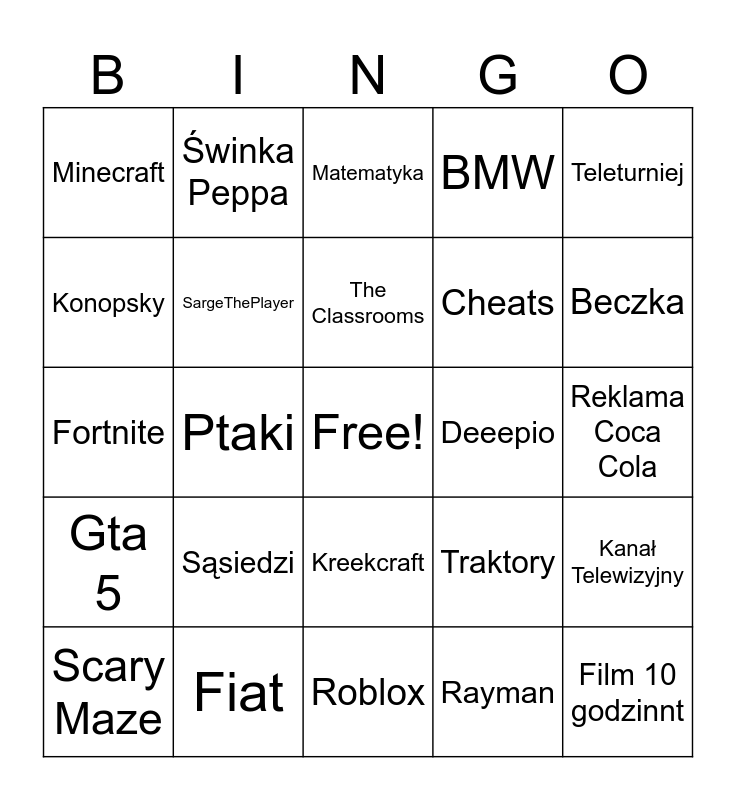 This bingo card has a free space and 24 words: Sąsiedzi, Fiat, The Classrooms, Scary Maze, Teleturniej, Minecraft, Konopsky, Świnka Peppa, Deeepio, Kreekcraft, Cheats, Fortnite, Traktory, Kanał Telewizyjny, SargeThePlayer, Rayman, Reklama Coca Cola, Matematyka, Beczka, Ptaki, Film 10 godzinnt, Gta 5, BMW and Roblox.