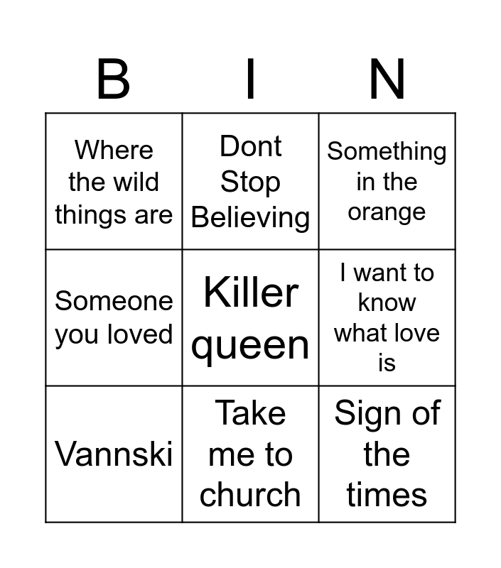This bingo card has a free space and 18 words: Baby, du er rå, Den fineste chevyen, Something in the orange, Where the wild things are, Cruel summer, Someone you loved, Please Please Please, Dont Stop Believing, Take me to church, Take me home, country roads, This Love, Sign of the times, Come and get your love, I want to know what love is, Vannski, Fest hos kalas, Maria and Muggene er megasvære.