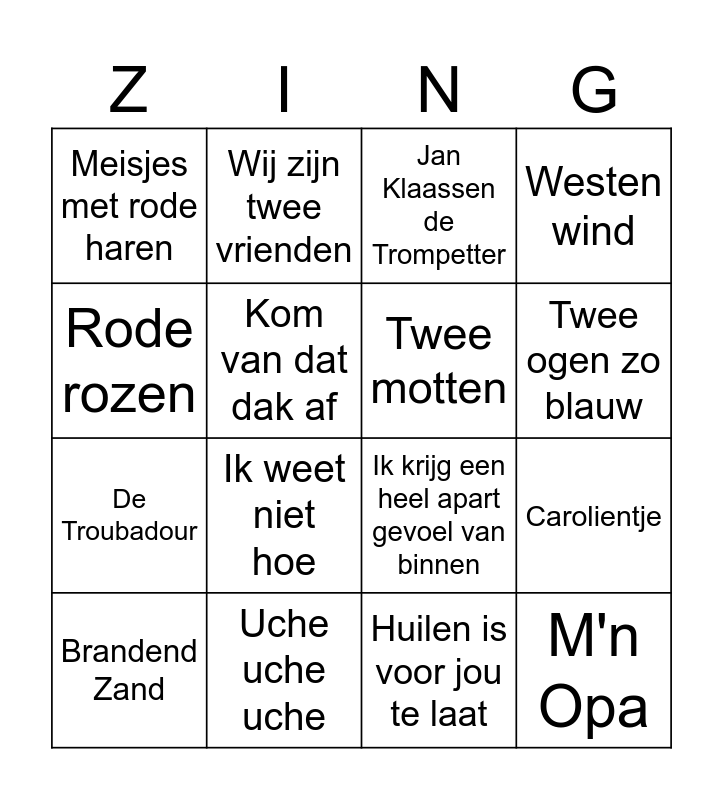 This bingo card has 35 words: Koffie koffie, Nikita, Alle duiven op de Dam, Twee motten, Met de vlam in de pijp, Westen wind, Kom van dat dak af, Engelen bestaan niet, Twee ogen zo blauw, Kleine Jodel jongen, Ik krijg een heel apart gevoel van binnen, Rode rozen, Och was ik maar bij moeder thuis gebleven, Daar bij de waterkant, Meisjes met rode haren, Uche uche uche, 't was aan de Costa del Sol, Carolientje, M'n Opa, Brandend Zand, Zijn het je ogen, Foxie Foxtrot, Bonnie kom je buiten spelen, Oerend Hard, Jan Klaassen de Trompetter, Ik weet niet hoe, Visite, Rocky, De Troubadour, Huilen is voor jou te laat, De liefde van de man gaat door de maag, Er staat een paard in de gang, Vogeltjes dans, Wij zijn twee vrienden and Guus kom naar huus.
