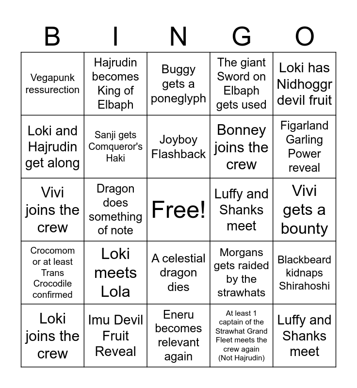 This bingo card has a free space and 24 words: Loki meets Lola, Imu Devil Fruit Reveal, Joyboy Flashback, Loki joins the crew, Loki has Nidhoggr devil fruit, Vegapunk ressurection, Loki and Hajrudin get along, Hajrudin becomes King of Elbaph, Luffy and Shanks meet, A celestial dragon dies, Bonney joins the crew, Vivi joins the crew, Morgans gets raided by the strawhats, Blackbeard kidnaps Shirahoshi, Sanji gets Comqueror's Haki, At least 1 captain of the Strawhat Grand Fleet meets the crew again (Not Hajrudin), Vivi gets a bounty, Buggy gets a poneglyph, Figarland Garling Power reveal, Dragon does something of note, Luffy and Shanks meet, Crocomom or at least Trans Crocodile confirmed, The giant Sword on Elbaph gets used and Eneru becomes relevant again.