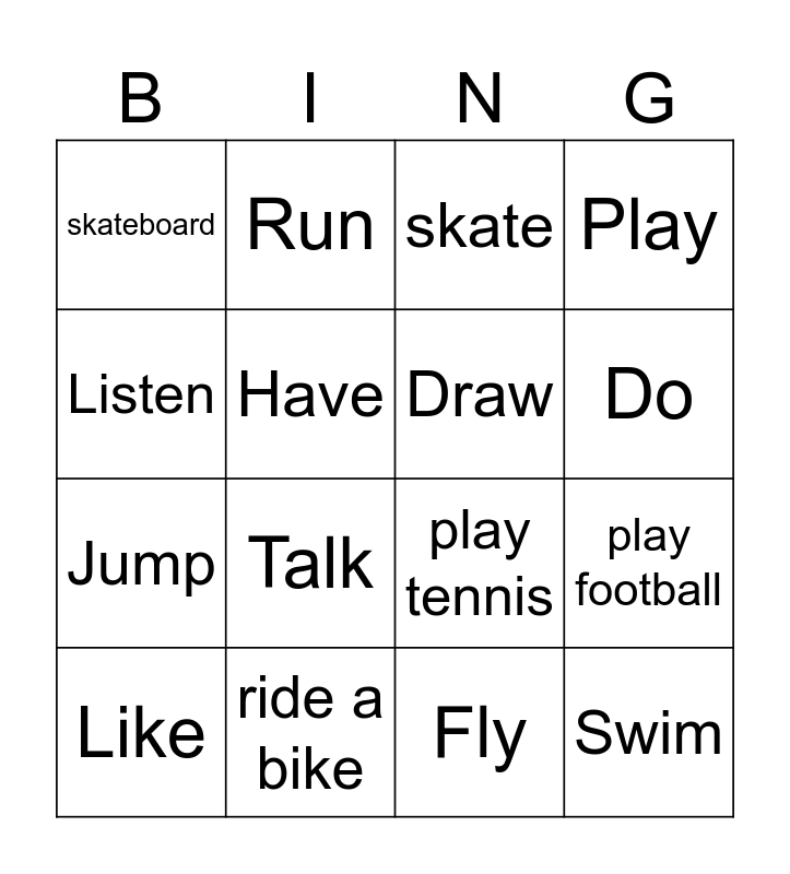 This bingo card has 16 words: ride a bike, play football, skate, skateboard, Jump, Run, play tennis, Fly, Listen, Have, Like, Play, Talk, Do, Draw and Swim.