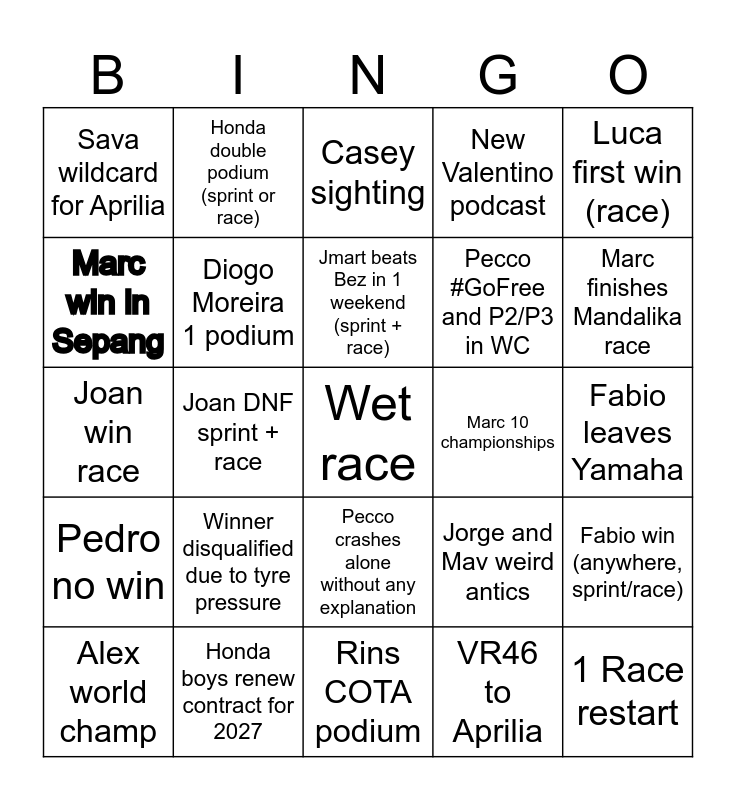 This bingo card has 25 words: Winner disqualified due to tyre pressure, Rins COTA podium, Jmart beats Bez in 1 weekend (sprint + race), Alex world champ, Luca first win (race), Sava wildcard for Aprilia, Marc win in Sepang, Honda double podium (sprint or race), Marc 10 championships, Pecco crashes alone without any explanation, Pecco #GoFree and P2/P3 in WC, Joan win race, Jorge and Mav weird antics, Fabio win (anywhere, sprint/race), Diogo Moreira 1 podium, 1 Race restart, Fabio leaves Yamaha, Casey sighting, Marc finishes Mandalika race, Joan DNF sprint + race, Wet race, Honda boys renew contract for 2027, Pedro no win, New Valentino podcast and VR46 to Aprilia.