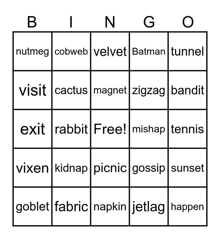 This bingo card has a free space and 28 words: sunset, laptop, zigzag, jetlag, visit, velvet, cobweb, vixen, mishap, goblet, exit, Batman, fabric, napkin, bandit, tablet, kidnap, cactus, magnet, picnic, nutmeg, public, happen, rabbit, tennis, gossip, tunnel and cannot.