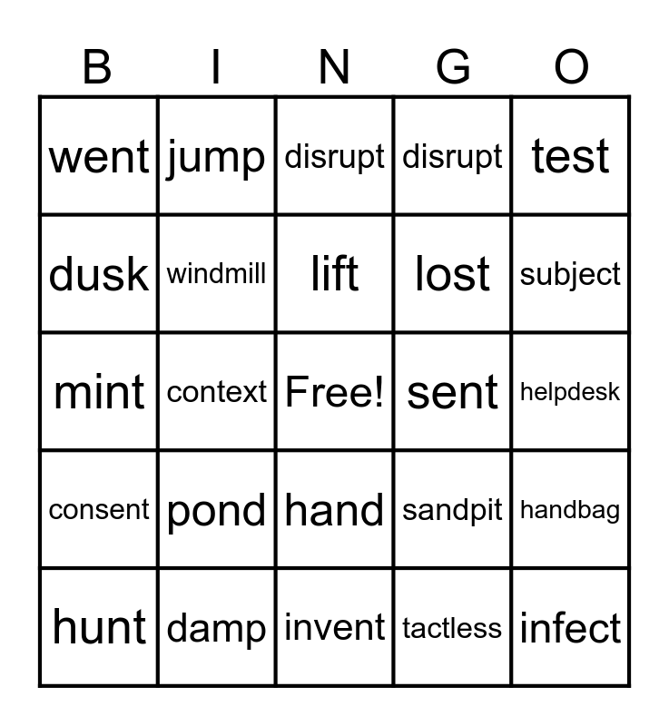 This bingo card has a free space and 24 words: pond, damp, lift, hunt, test, went, dusk, jump, sent, hand, lost, mint, sandpit, handbag, windmill, tactless, helpdesk, disrupt, subject, context, infect, consent, disrupt and invent.