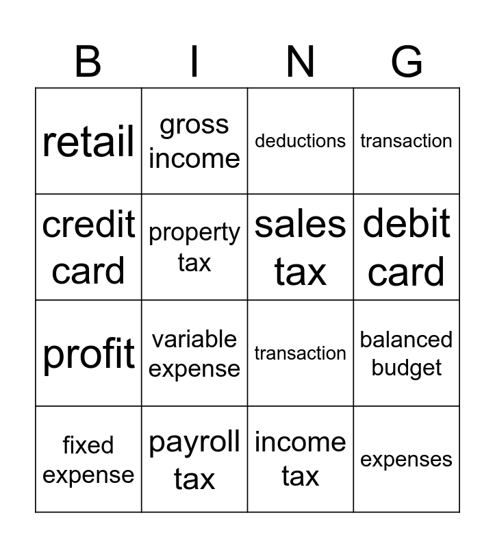 This bingo card has 22 words: payroll tax, income, gross income, net income, property tax, sales tax, retail, deductions, transaction, expenses, profit, transaction, employer, employee, income tax, budget, balanced budget, fixed expense, variable expense, credit card, debit card and check.