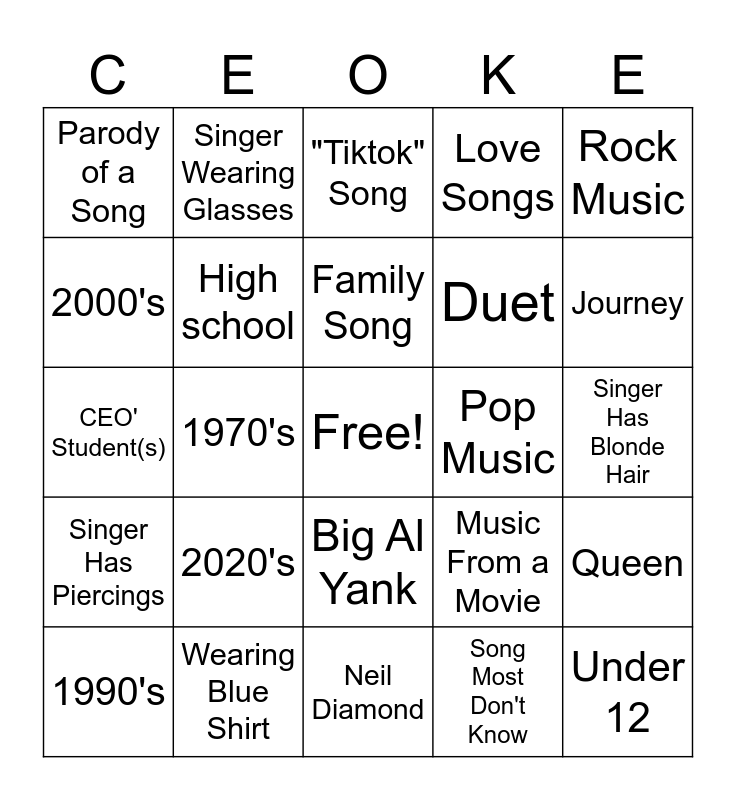 This bingo card has a free space and 24 words: 2020's, Wearing Blue Shirt, Family Song, 1990's, Rock Music, Parody of a Song, 2000's, Singer Wearing Glasses, Pop Music, Big Al Yank, Duet, CEO' Student(s), Music From a Movie, Queen, High school, Song Most Don't Know, Singer Has Blonde Hair, "Tiktok" Song, Journey, 1970's, Under 12, Singer Has Piercings, Love Songs and Neil Diamond.