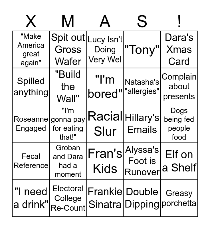 This bingo card has a free space and 24 words: Groban and Dara had a moment, Electoral College Re-Count, "I'm bored", "I need a drink", Dara's Xmas Card, "Make America great again", Spilled anything, Spit out Gross Wafer, Hillary's Emails, Fran's Kids, Natasha's "allergies", Roseanne Engaged, Alyssa's Foot is Runover, Elf on a Shelf, "Build the Wall", Double Dipping, Dogs being fed people food, Lucy Isn't Doing Very Wel, Complain about presents, "I'm gonna pay for eating that!", Greasy porchetta, Fecal Reference, "Tony" and Frankie Sinatra.