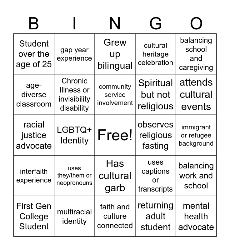 This bingo card has a free space and 29 words: First Gen College Student, Uses accessibility accommodations, LGBTQ+ Identity, Practices a non-Christian Religion, Student over the age of 25, Grew up bilingual, Chronic Illness or invisibility disability, uses they/them or neopronouns, observes religious fasting, multiracial identity, immigrant or refugee background, mental health advocate, faith and culture connected, returning adult student, attends cultural events, neurodivergent, Has cultural garb, interfaith experience, balancing school and caregiving, racial justice advocate, uses captions or transcripts, ally to LGBTQ+ peers, Spiritual but not religious, age-diverse classroom, cultural heritage celebration, gap year experience, balancing work and school, community service involvement and Recovery person or support person.