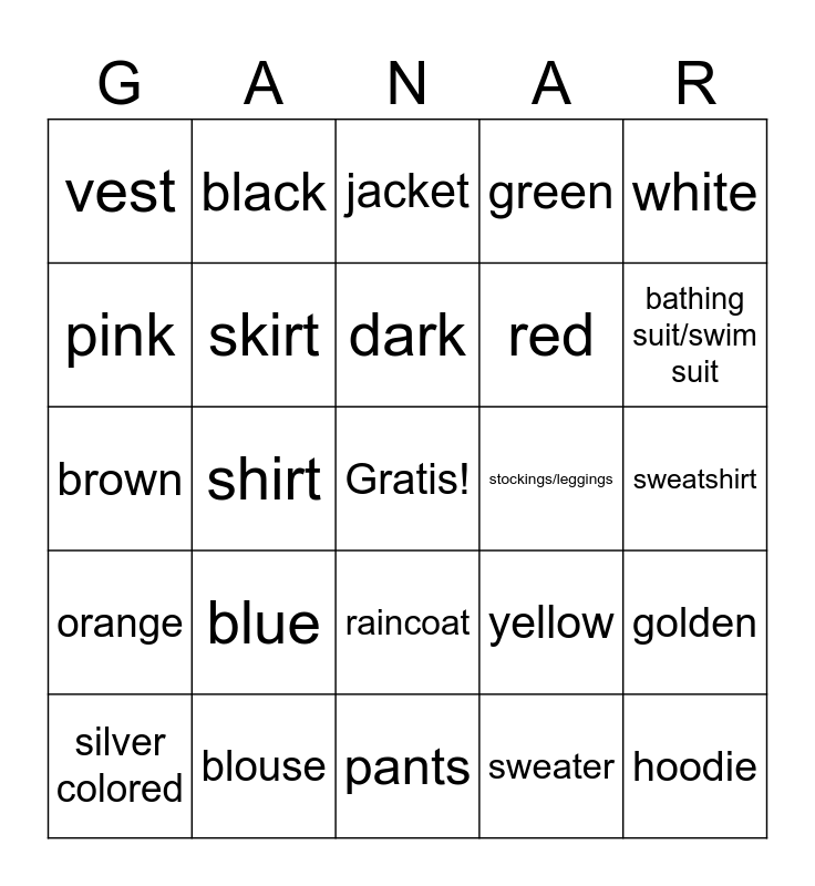 This bingo card has a free space and 30 words: blouse, socks, shirt, t-shirt, vest, jacket, skirt, raincoat, stockings/leggings, pants, sweatshirt, hoodie, sweater, suit, bathing suit/swim suit, dress, yellow, orange, blue, white, brown, purple, black, red, pink, green, golden, silver colored, dark and light.