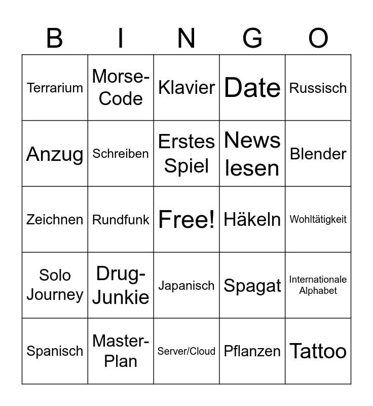 This bingo card has a free space and 24 words: Drug-Junkie, Master-Plan, Erstes Spiel, Spanisch, Russisch, Terrarium, Anzug, Morse-Code, Häkeln, Japanisch, News lesen, Zeichnen, Spagat, Internationale Alphabet, Schreiben, Pflanzen, Wohltätigkeit, Klavier, Blender, Rundfunk, Tattoo, Solo Journey, Date and Server/Cloud.