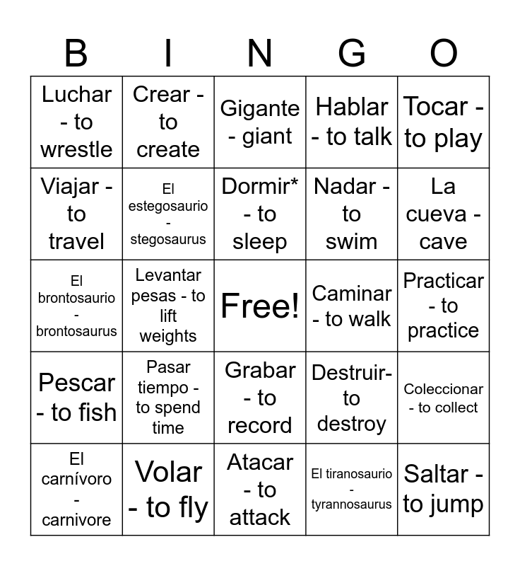 This bingo card has a free space and 64 words: Beber - to drink, Caminar - to walk/hike, Cocinar - to cook, Coleccionar - to collect, Comer - to eat, Correr - to run, Crear - to create, Dibujar - to draw, Dormir* - to sleep, Escribir - to write, Grabar - to record, Pintar - to paint, Practicar - to practice, Tocar - to play, Trabajar - to work, Viajar - to travel, Levantar pesas - to lift weights, Luchar - to wrestle, Mirar - to watch, Nadar -to swim, Pasar tiempo - to spend time, Pescar - to fish, Hablar - to talk, Hacer* - to make/do, El huevo - egg, El hueso - bone, El cuerno - horn, La garra - claw, La cola - tail, El diente - tooth, El esqueleto - skeleton, El fósil - fossil, El volcán - volcano, El bosque - forest, La cueva - cave, El carnívoro - carnivore, El herbívoro - herbivore, El tiranosaurio - tyrannosaurus, El velociraptor - velociraptor, El estegosaurio - stegosaurus, El brontosaurio - brontosaurus, Caminar - to walk, Correr - to run, Comer - to eat, Morder - to bite, Saltar - to jump, Volar - to fly, Explotar - to explode, Destruir- to destroy, Cavar - to dig, Excavar - to excavate, Perseguir - to chase, Atacar - to attack, Romper - to break, Extinto - extinct, Grande - big, Gigante - giant, Pequeño - small, Fuerte - strong, Alto - tall, Bajo - short, Rápido - fast, Lento - slow and El dinosaurio - dinosaur.