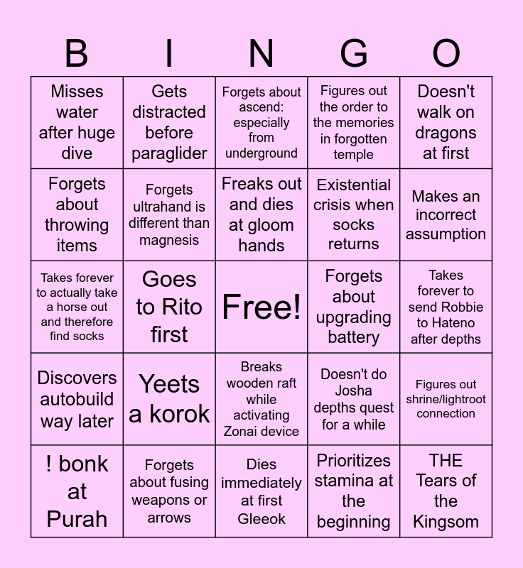 This bingo card has a free space and 24 words: Yeets a korok, Forgets about fusing weapons or arrows, Freaks out and dies at gloom hands, ! bonk at Purah, Doesn't walk on dragons at first, Misses water after huge dive, Forgets about throwing items, Gets distracted before paraglider, Forgets about upgrading battery, Breaks wooden raft while activating Zonai device, Existential crisis when socks returns, Takes forever to actually take a horse out and therefore find socks, Doesn't do Josha depths quest for a while, Figures out shrine/lightroot connection, Forgets ultrahand is different than magnesis, Prioritizes stamina at the beginning, Takes forever to send Robbie to Hateno after depths, Forgets about ascend: especially from underground, Makes an incorrect assumption, Goes to Rito first, THE Tears of the Kingsom, Discovers autobuild way later, Figures out the order to the memories in forgotten temple and Dies immediately at first Gleeok.