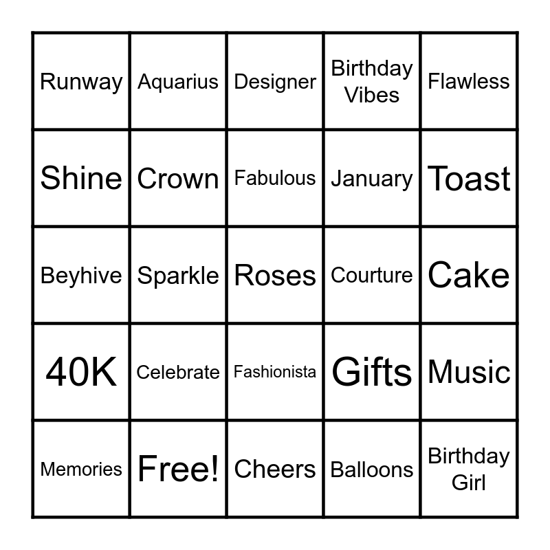 This bingo card has 30 words: Free!, High Heels, Sparkle, Glam, Runway, Designer, Crown, Fashionista, Courture, Cheers, Cake, Roses, Balloons, Birthday Girl, Toast, Party, Gifts, 40K, Celebrate, Flawless, Beyhive, Champagne, Aquarius, January, Shine, Birthday Vibes, Music, Memories, Fabulous and Donations.