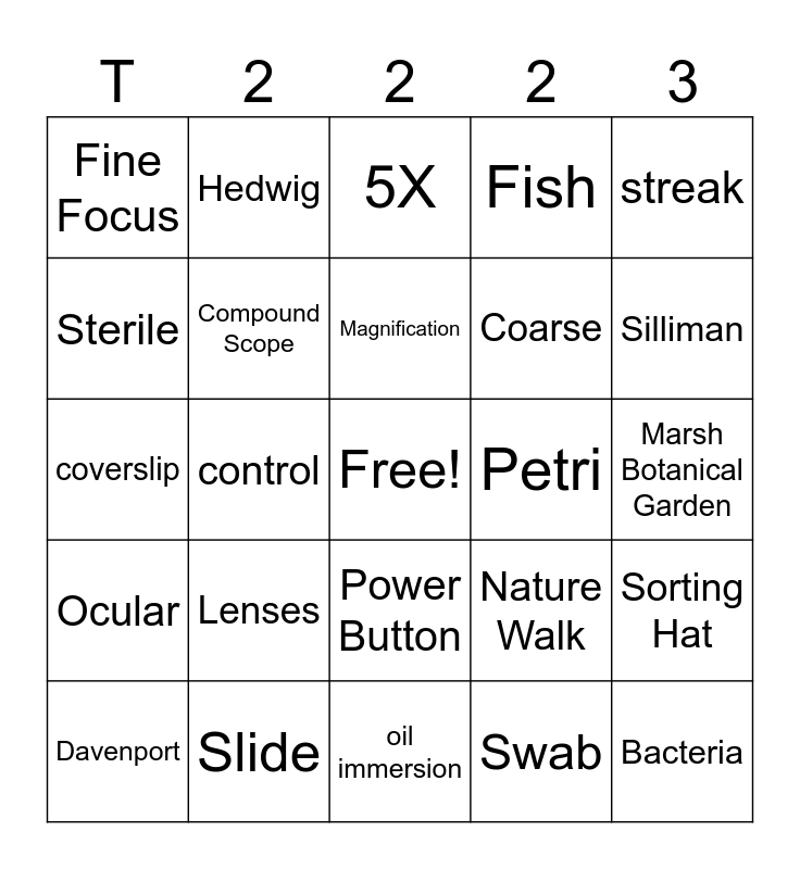 This bingo card has a free space and 29 words: Davenport, Safety Shower, control, Morse, Fine Focus, 5X, Compound Scope, Lenses, Petri, Slide, Marsh Botanical Garden, Bacteria, oil immersion, Swab, Silliman, Insect, Power Button, Ocular, streak, coverslip, Nature Walk, Branford, Coarse, Sterile, Fish, Hedwig, Sorting Hat, Magnification and Objective.