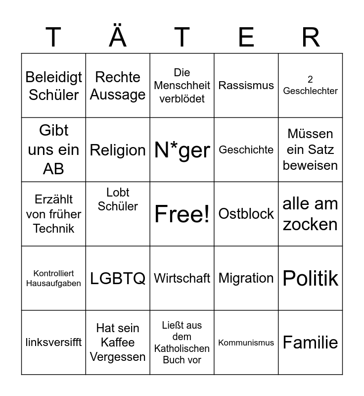 This bingo card has a free space and 24 words: linksversifft, LGBTQ, N*ger, Kommunismus, 2 Geschlechter, Beleidigt Schüler, Rechte Aussage, Die Menschheit verblödet, Ostblock, alle am zocken, Erzählt von früher Technik, Religion, Migration, Politik, Gibt uns ein AB, Hat sein Kaffee Vergessen, Ließt aus dem Katholischen Buch vor, Rassismus, Müssen ein Satz beweisen, Kontrolliert Hausaufgaben, Lobt Schüler, Wirtschaft, Geschichte and Familie.