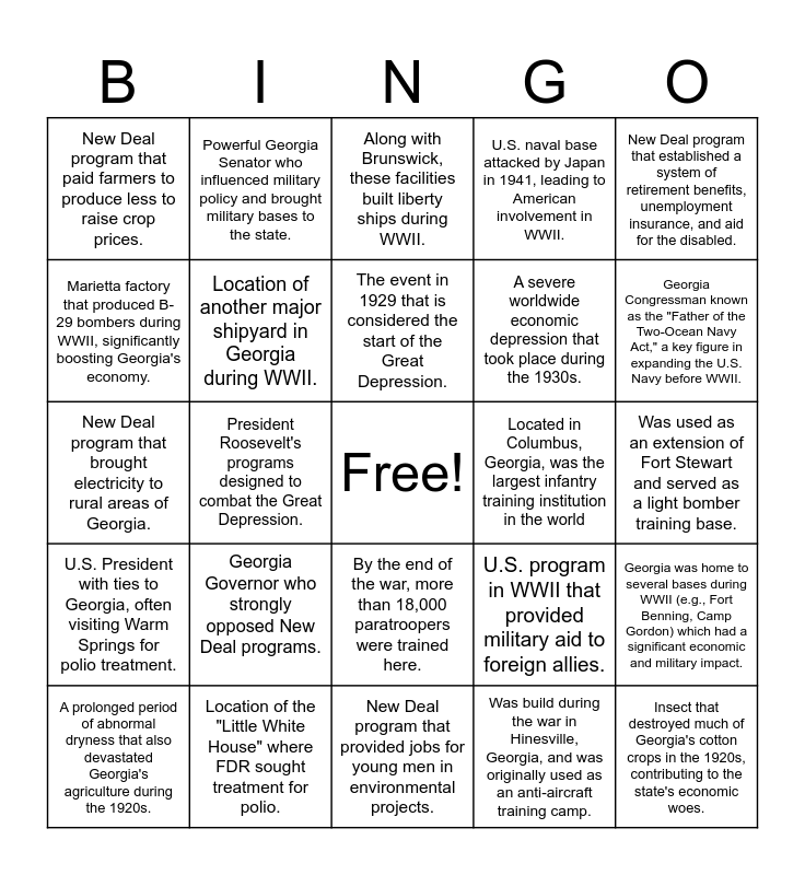 This bingo card has a free space and 24 words: Georgia Governor who strongly opposed New Deal programs., Location of the "Little White House" where FDR sought treatment for polio., The event in 1929 that is considered the start of the Great Depression., A prolonged period of abnormal dryness that also devastated Georgia's agriculture during the 1920s., New Deal program that established a system of retirement benefits, unemployment insurance, and aid for the disabled., New Deal program that paid farmers to produce less to raise crop prices., Marietta factory that produced B-29 bombers during WWII, significantly boosting Georgia's economy., Powerful Georgia Senator who influenced military policy and brought military bases to the state., Located in Columbus, Georgia, was the largest infantry training institution in the world, By the end of the war, more than 18,000 paratroopers were trained here., A severe worldwide economic depression that took place during the 1930s., New Deal program that brought electricity to rural areas of Georgia., U.S. program in WWII that provided military aid to foreign allies., Georgia was home to several bases during WWII (e.g., Fort Benning, Camp Gordon) which had a significant economic and military impact., Location of another major shipyard in Georgia during WWII., Was build during the war in Hinesville, Georgia, and was originally used as an anti-aircraft training camp., Was used as an extension of Fort Stewart and served as a light bomber training base., Along with Brunswick, these facilities built liberty ships during WWII., Georgia Congressman known as the "Father of the Two-Ocean Navy Act," a key figure in expanding the U.S. Navy before WWII., President Roosevelt's programs designed to combat the Great Depression., Insect that destroyed much of Georgia's cotton crops in the 1920s, contributing to the state's economic woes., U.S. President with ties to Georgia, often visiting Warm Springs for polio treatment., U.S. naval base attacked by Japan in 1941, leading to American involvement in WWII. and New Deal program that provided jobs for young men in environmental projects..